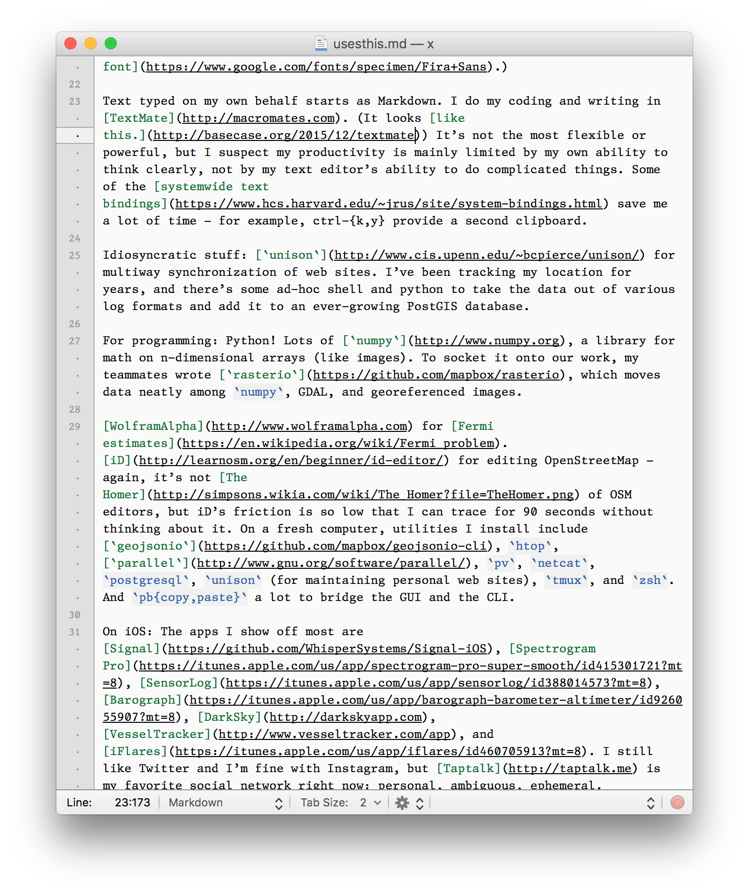 Text typed on my own behalf starts as Markdown. I do my coding and writing in TextMate, which looks like this. It's not the most flexible or powerful, but the dominant limit on my productivity is my brain, not my text editor. The system-wide text bindings are handy - for example, ctrl-{k,y} provide a limited second clipboard.